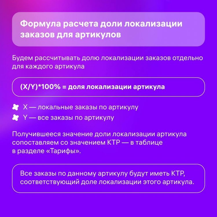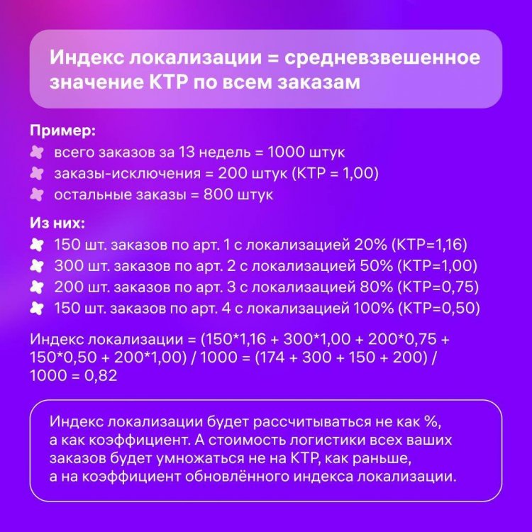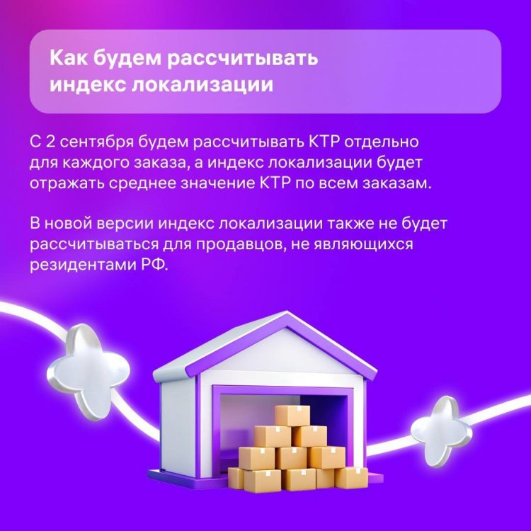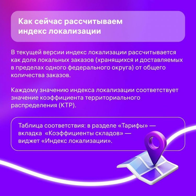 С 1 июля «Индекс локализации» будет влиять на стоимость логистики по FBO. Если с домашних складов к клиентам едут: от 70% до 100% ваших товаров — логистика для вас станет дешевле до 50%; от 55% до 69% — стоимость логистики будет такой же, как сейчас; от 0% до 54% — логистика будет дороже на 10-30%. Отметим несколько моментов, о которых часто спрашивали: Меняться индекс будет не после поставки товаров на склад, а после их продажи. Индекс влияет только на стоимость логистики ДО покупателя — сборка, последняя миля и обратная логистика от него не зависят. На FBS показываем индекс локализации лишь для информации — чтобы вы понимали, стоит ли перевести какие-то товары на FBO, чтобы экономить на логистике. А в карточках показали, что в целом вам даст распределение товаров по регионам. Подробнее про «Индекс локализации» Источник: Ozon Marketplace