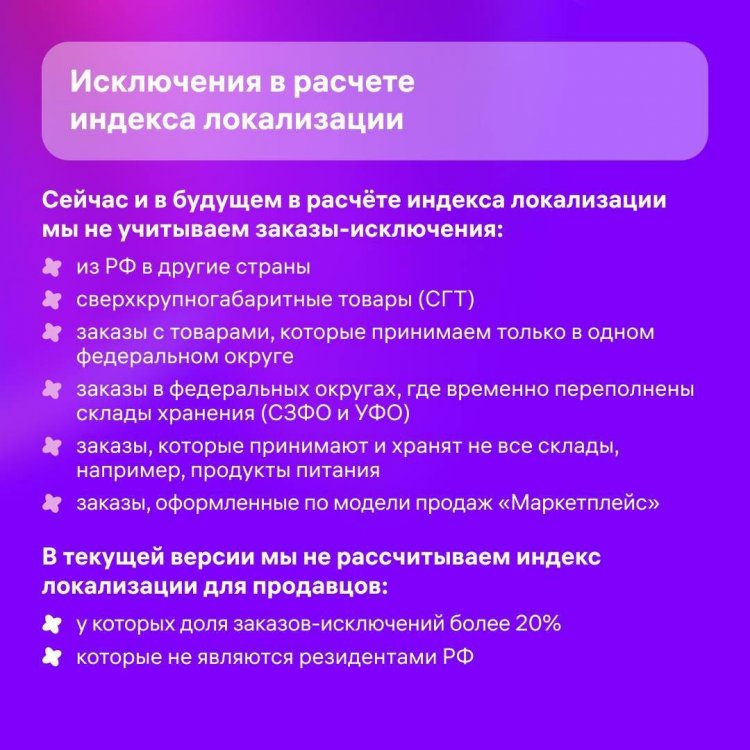 Высокая загруженность складов усложняет распределение остатков по регионам для улучшения индекса локализации. Дополнительные складские мощности помогут облегчить процесс управления остатками и сделать его выгоднее. Ещё несколько деталей обновления расчёта индекса локализации: Сибирский и Дальневосточный федеральные округа объединятся в один кластер (СФО+ДФО), внутри которого заказы будут считаться локальными. Северо-Западный и Уральский федеральные округа теперь снова будут учитываться в расчёте индекса локализации. -