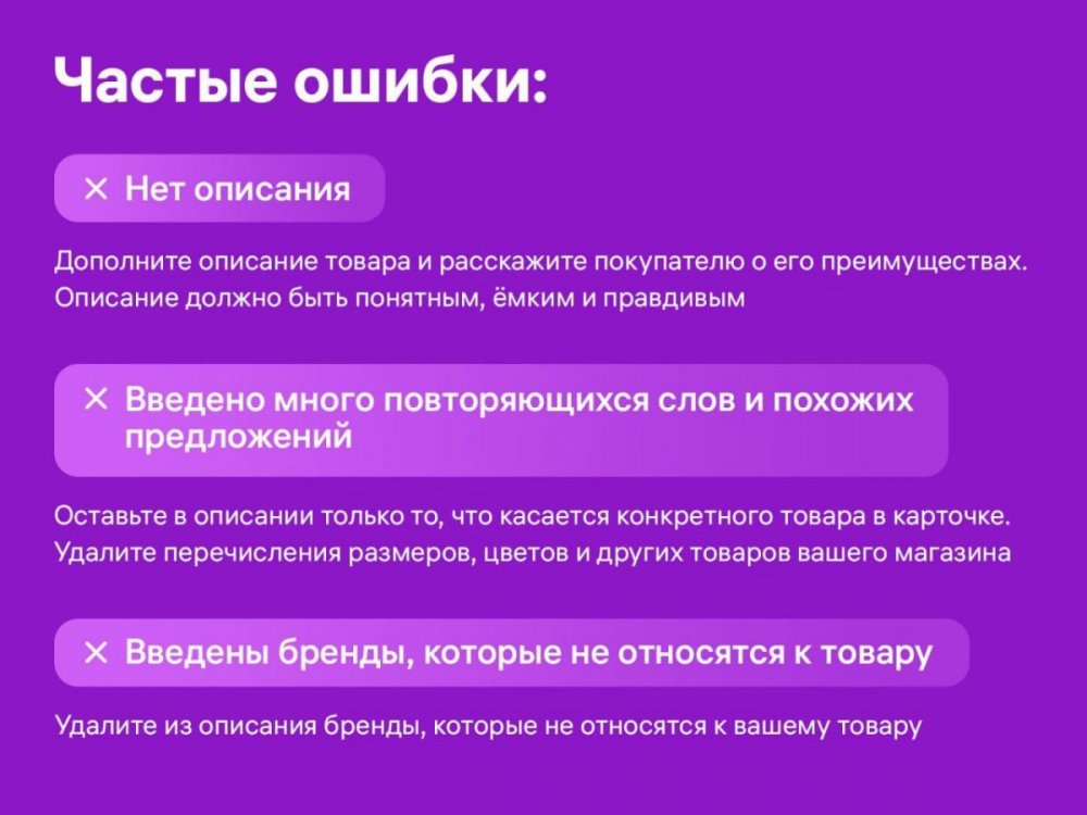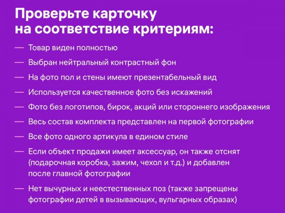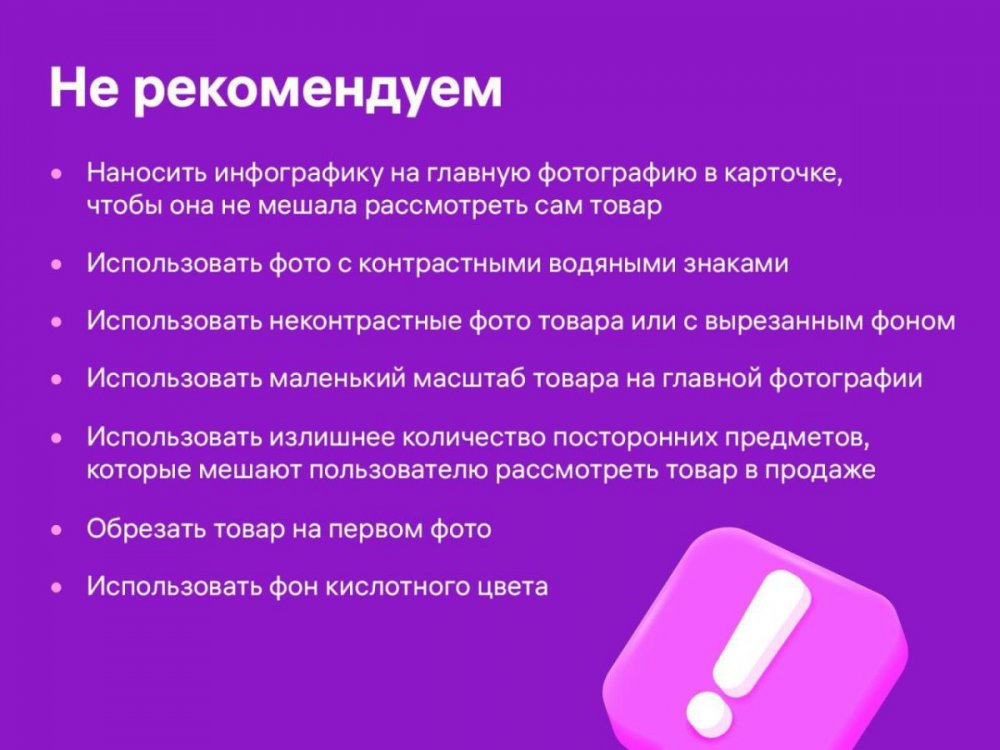 Используйте всю область карточки. Чтобы не было пустых полей по бокам, можно накладывать фон (например, увеличенное изображение с блюром). Карточка должна быть читаема. Мелкие детали не видно на мобильной версии. Инфографика хорошо работает, когда она минималистична. Используйте контрастные цвета для лучшей читабельности всех элементов карточки: фон, шрифты, плашки и тд. Следите за визуальными центрами и контрастом. Если вы разделяете карточку на блоки, они должны четко выполнять свою рекламную функцию. Уделяйте внимание шрифту. Важные критерии — читаемость и соотношение цветов. Следите за графическими трендами. Используйте чистые цвета и оттенки для оформления карточек. Учитывайте в композиции, что в период распродаж может быть дополнительная плашка со скидкой, которая перекроет часть карточки. Источник: WB Партнеры