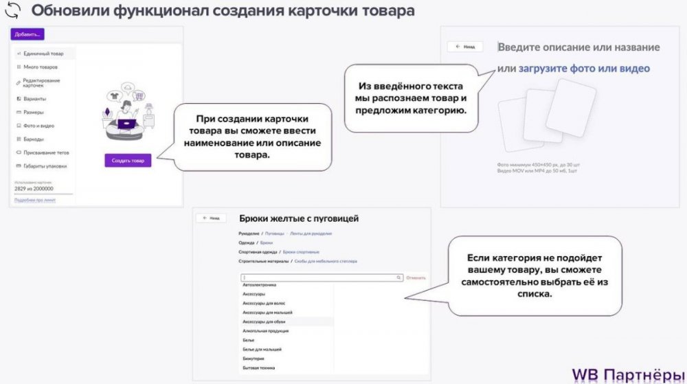 Теперь при создании карточки товара, когда вы вводите наименование или описание товара, система подскажет подходящую категорию для вашего товара. Если предложенная категория не соответствует вашему товару, вы всегда можете самостоятельно выбрать нужную категорию из списка.-