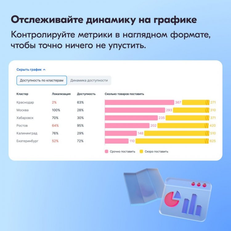 Обновлён отчёт «Доступность товаров». Теперь Ozon показываеn доступность не только в разрезе по товарам, но и по кластерам — чтобы продавцам было ещё проще анализировать информацию и решать, какие товары включать в поставки и куда их отправлять. Подробнее об изменениях в карточках: О том, как пользоваться отчётом — в «Базе знаний» -