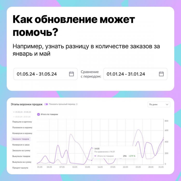 В новой версии отчёта «Воронка продаж» стал доступен выбор периодов вплоть до дня для отслеживания продаж в рамках года. Помимо этого, продавцы смогут проанализировать долю карточки товара в общей выручке. Как это сделать: Зайдите в отчёт; Выберите в отчёте интересующий для сравнения период анализа; Укажите фильтры для поиска необходимых данных; Используйте и контролируйте данные воронки продаж. Отчёт «Воронка продаж» помогает: Понять поведение пользователей при выборе товара и его покупке; Отследить каждый этап воронки; Анализировать эффекты от маркетинговых активностей.-