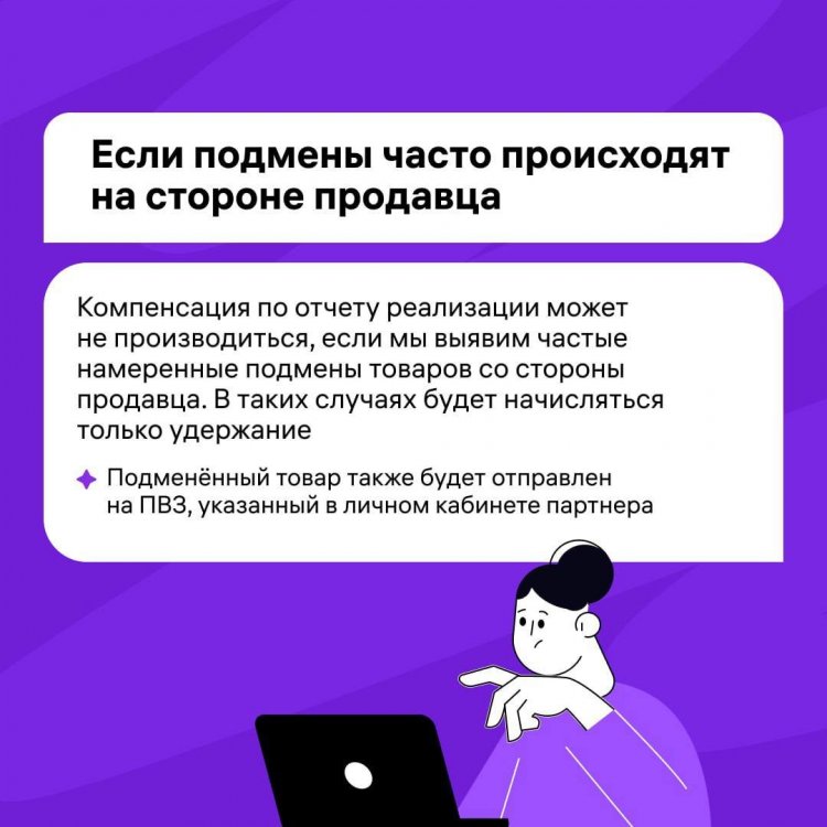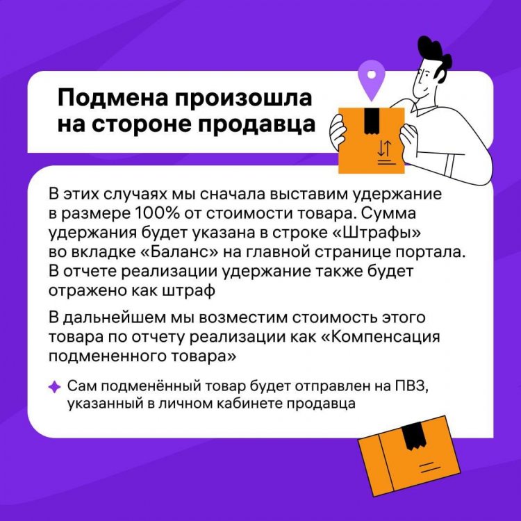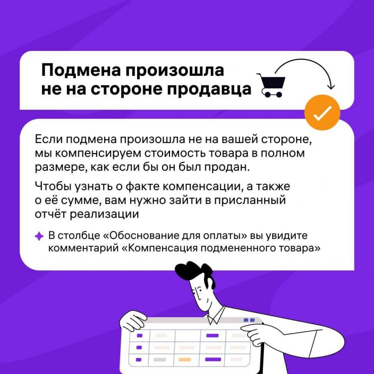 С этого дня будем возвращать вам деньги, если узнаем, что ваш товар кто-то подменил. Вам ничего делать не нужно: мы сами соберём информацию при выдаче покупателю, на приёмке или сортировке. Вы получите всю стоимость товара — как если бы его у вас купили: по актуальной цене на тот день, когда обнаружилась подмена, без учёта скидки постоянного покупателя и за вычетом комиссии. Эта сумма будет отражена в финансовом отчёте как «компенсация за подменённый товар». Сам товар вам не вернётся, а деньги будут у вас через 30 дней после обнаружения подмены — столько нам нужно для тщательной проверки.-