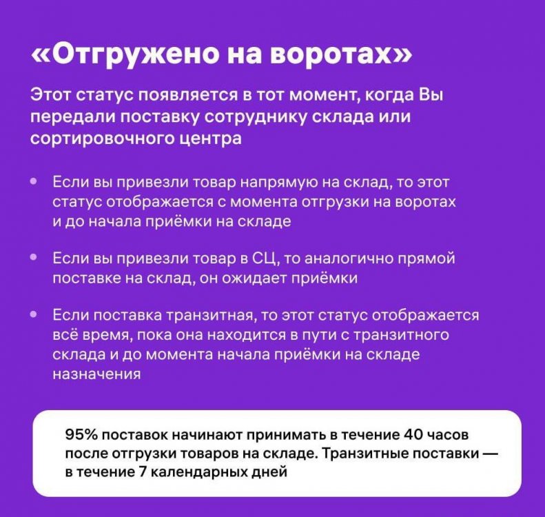Отслеживание поставок стало ещё точнее. После того, как вы доставите поставку на склад, в Личном кабинете отобразится статус: «Отгружено на воротах». Это значит, что скоро мы начнем принимать и раскладывать товары. Они будут готовы к продаже в течение 10 рабочих дней. Обычно справляемся за несколько суток.-