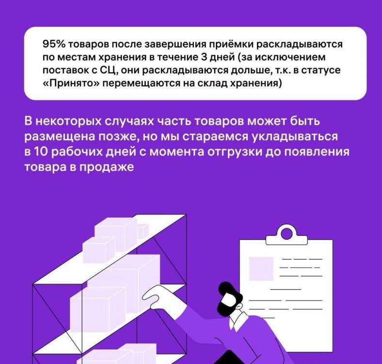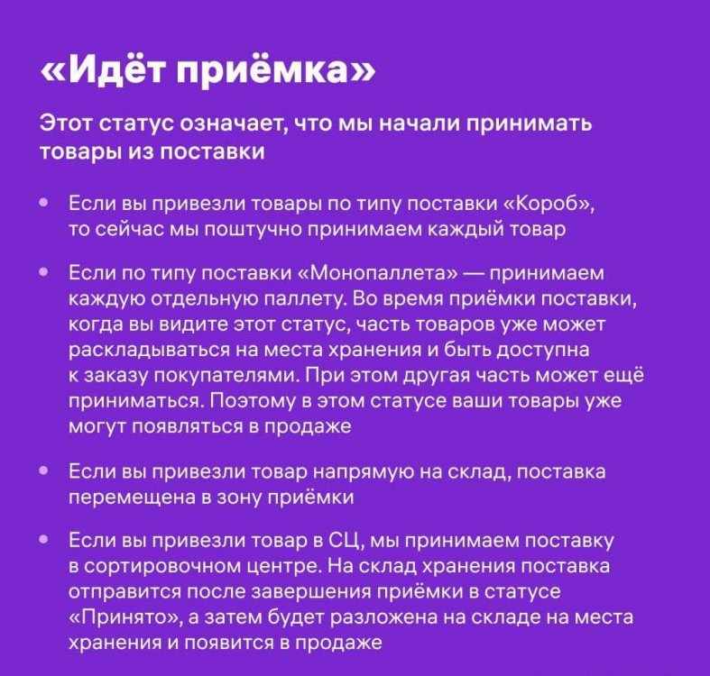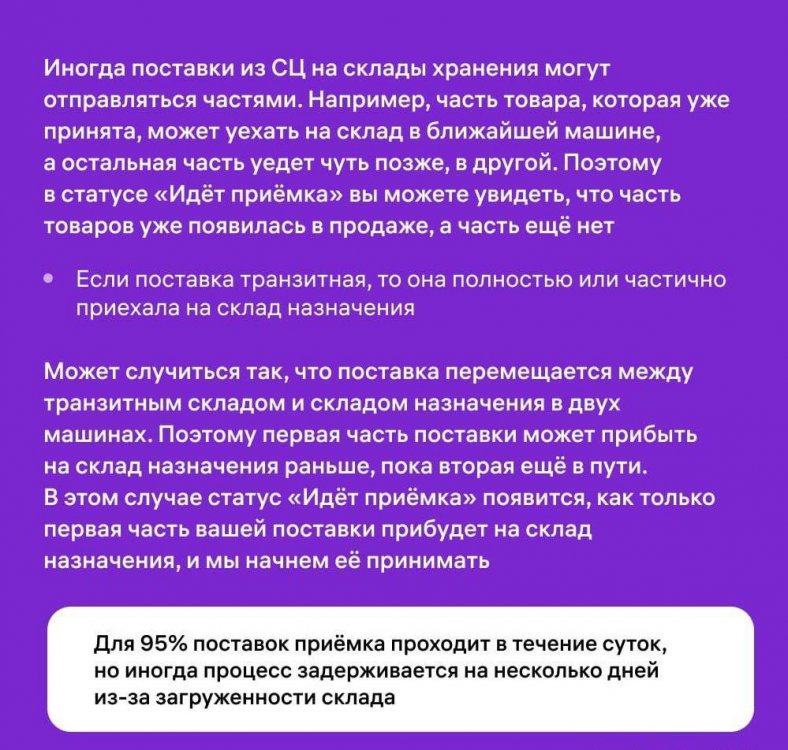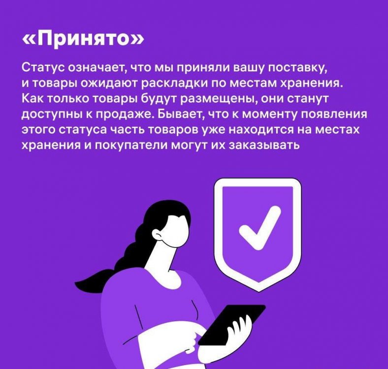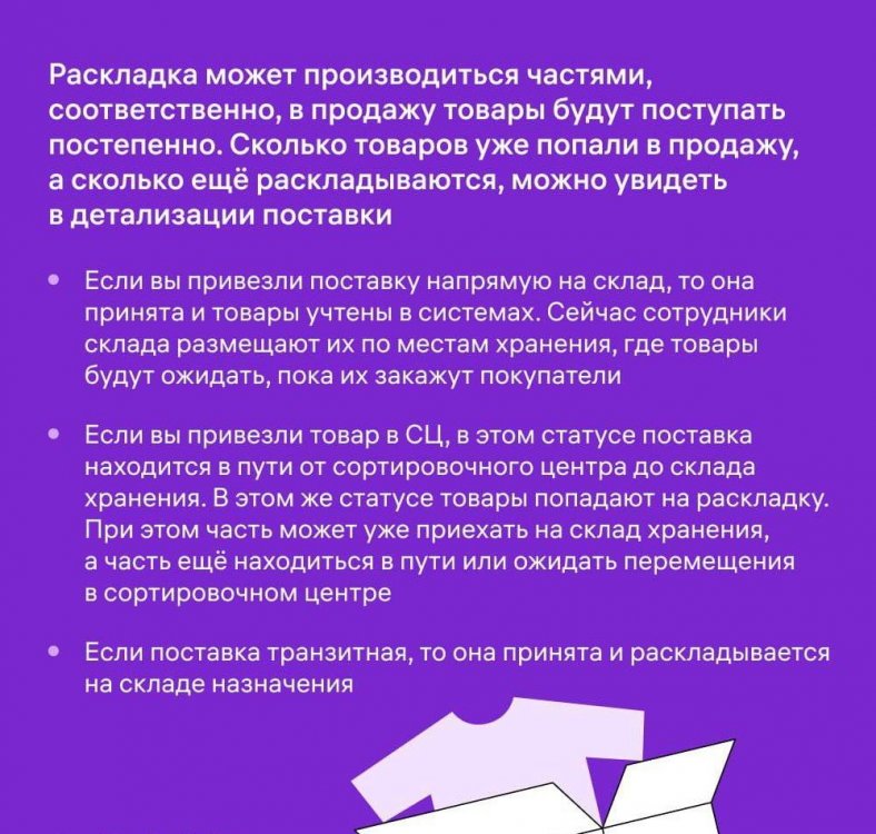 Теперь вы будете видеть, какие товары из вашей поставки уже разложены на складе и поступили в продажу. На это будет указывать новый статус — «Поступили в продажу». Кроме того, в детализации начнут отображаться товары, которые уже приняты, но пока находятся в процессе раскладки. Напоминаем, что с момента отгрузки товары принимаются и раскладываются в течение 10 рабочих дней. Нововведение упростит вашу работу и поможет быть в курсе актуального статуса ваших товаров. Пока новый статус доступен небольшому числу продавцов, но постепенно распространится на всех.-
